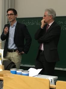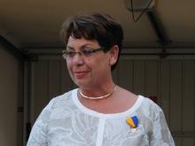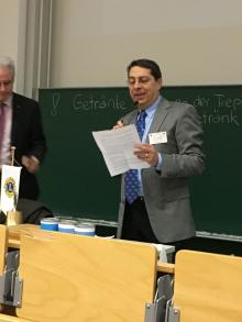 Anschließend betonte der Präsident kurz die Notwendigkeit der Spende und überreichte dann den symbolischen Scheck an Frau Müller. Die Rektorin wies noch einmal auf die Dringlichkeit des benötigten Materials für den Deutsch-Unterricht für Migrantenkinder hin.