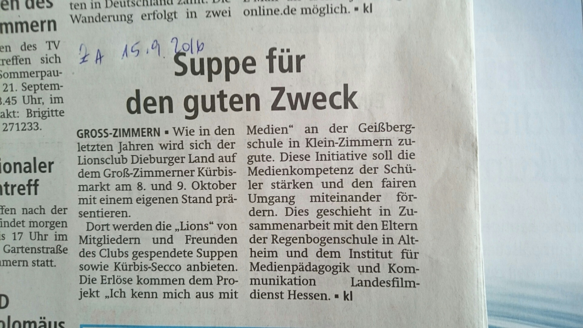 Am 12. Oktober übergab der Lionsclub Dieburger Land während des gut besuchten Kürbismarktes einen Scheck in Höhe von 2.027,65 Euro an die Friedensschule Groß-Zimmern. Mit diesem Geld will die Schule Anschaffungen für die Spracherziehung ihrer Intensivklasse tätigen.
