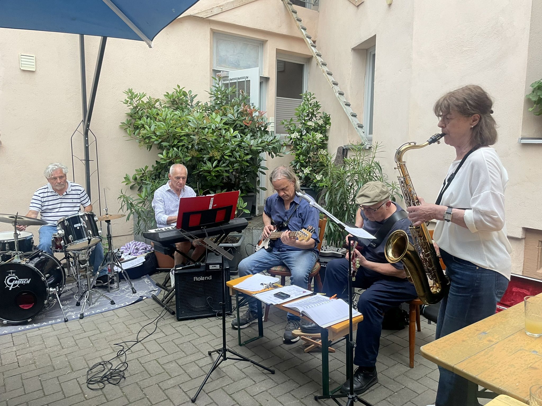 Als es gerade am schönsten war, die Steaks bruzzelten und der Apfelwein floss, brach ein Gewitter über Dieburg herein und erzwang nicht nur das plötzliche Ende der Musik, sondern auch die Verlagerung in die geschützten Bereiche des Apfelweinhofs. Nach gut einer Stunde Regen und himmlischem Grummeln beruhigte sich das Wetter wieder, und es kamen sogar neue Gäste, so dass die Veranstaltung wie geplant bis 20 Uhr weiterlaufen konnte, nur ohne den chilligen Jazz.